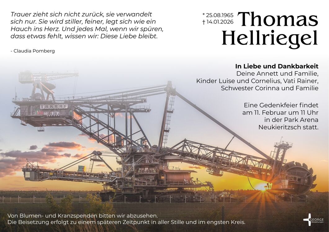 Information und Anzeige zur Trauerfeier des verstorbenen Thomas Hellriegel