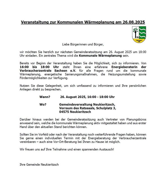 Veranstaltung zur Kommunalen Wärmeplanung am 26.08.2025